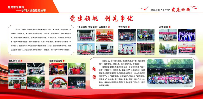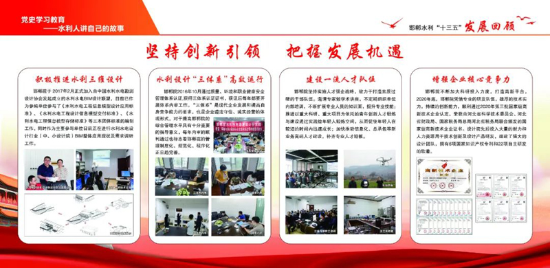 “十三五”期間設計院干部職工深入學習貫徹習近平新時代中國特色社會主義思想和黨的十九大精神,以新思想、新理念指引和推動企業(yè)發(fā)展;積極對接水利發(fā)展需求,投身邯鄲水利建設事業(yè),贏得各方贊許;保持戰(zhàn)略定力,主動變革,經營穩(wěn)中有進,全院保持發(fā)展強勁的態(tài)勢。